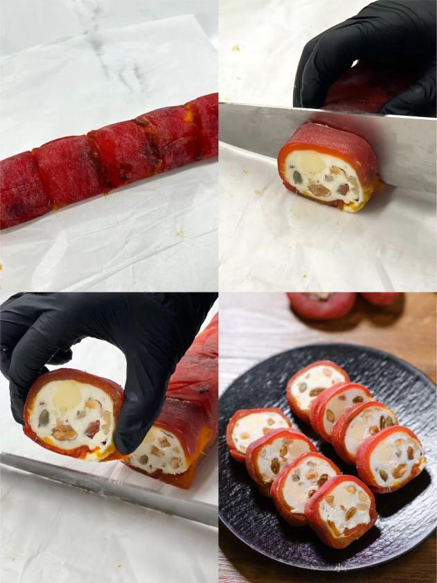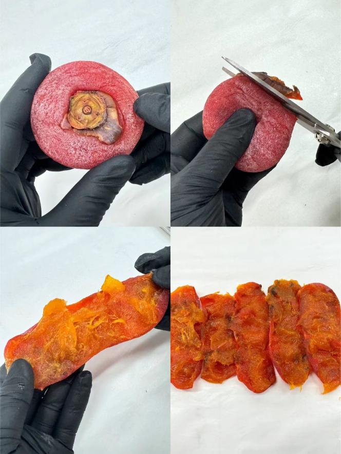 1. Удалите стебли с обоих концов сушеной хурмы и разрежьте их ножницами.