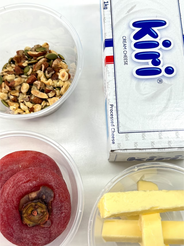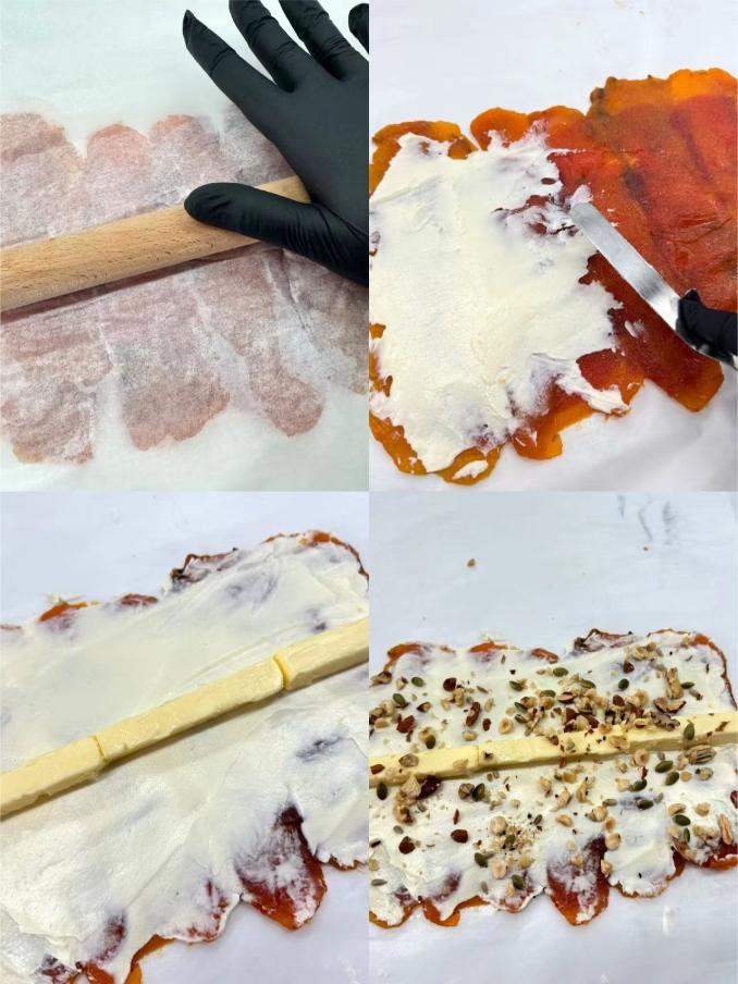 3. Добавьте сливочное масло, орехи, сухофрукты и сыр, затем сверните рулетом и поставьте в холодильник застывать на 30 минут.
