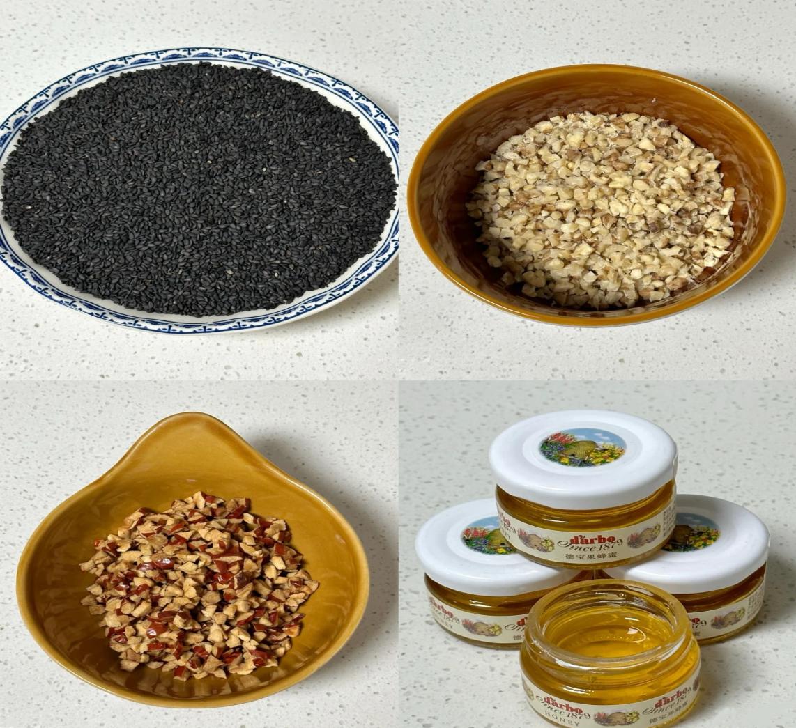 1. Просеиваем черный кунжут и обжариваем до готовности. Поджарьте грецкие орехи и нарежьте их небольшими кусочками, у красных фиников удалите сердцевину и нарежьте их небольшими кубиками. После обработки равномерно смешайте все ингредиенты.