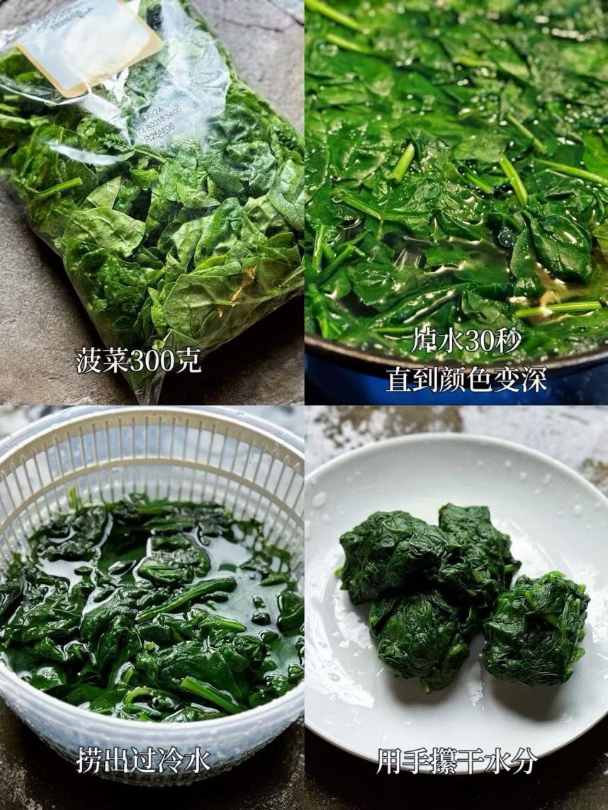 2. Приготовьте шпинат: вымойте шпинат. Бланшируйте в кипящей воде около 30 секунд, пока она не станет глубоким зеленым. Удалите и промойте несколько раз в холодной воде до охлаждения. Выжмите излишки воды вручную.