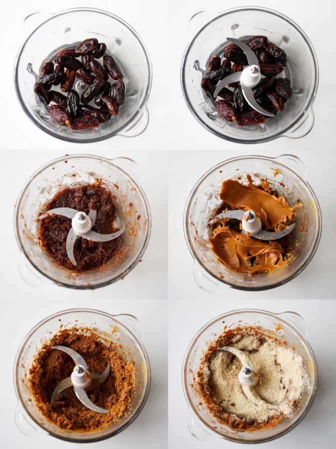 1. Поместите финики без косточек, 3 столовые ложки теплой воды и морскую соль в блендер. Взбивайте до получения однородной и густой массы. При необходимости добавьте еще немного воды, в зависимости от консистенции.