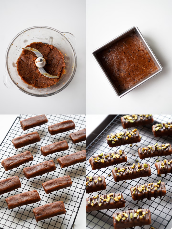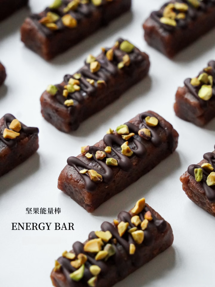 4. Растопите темный шоколад (около 50 г) на пароварке. Полейте энергетические батончики и посыпьте для украшения измельченными фисташками.